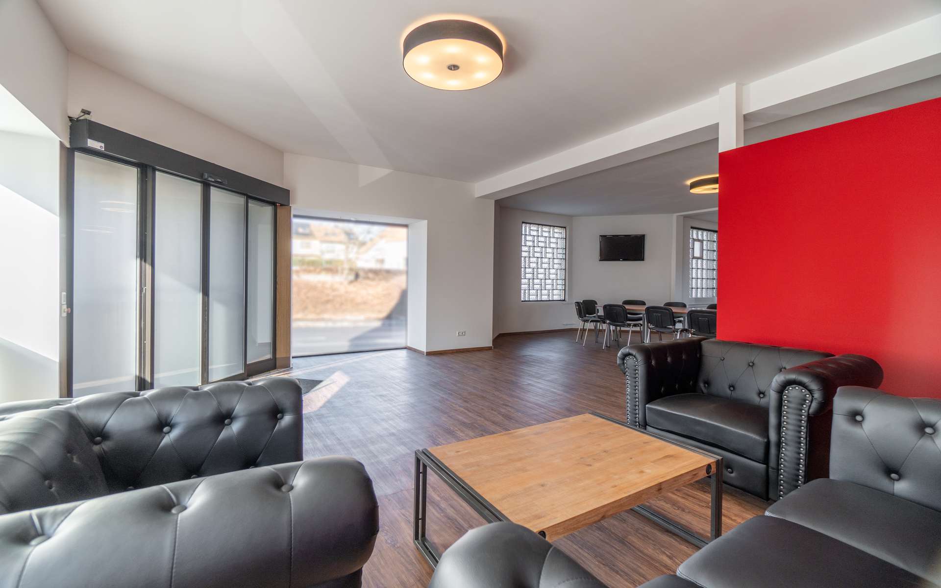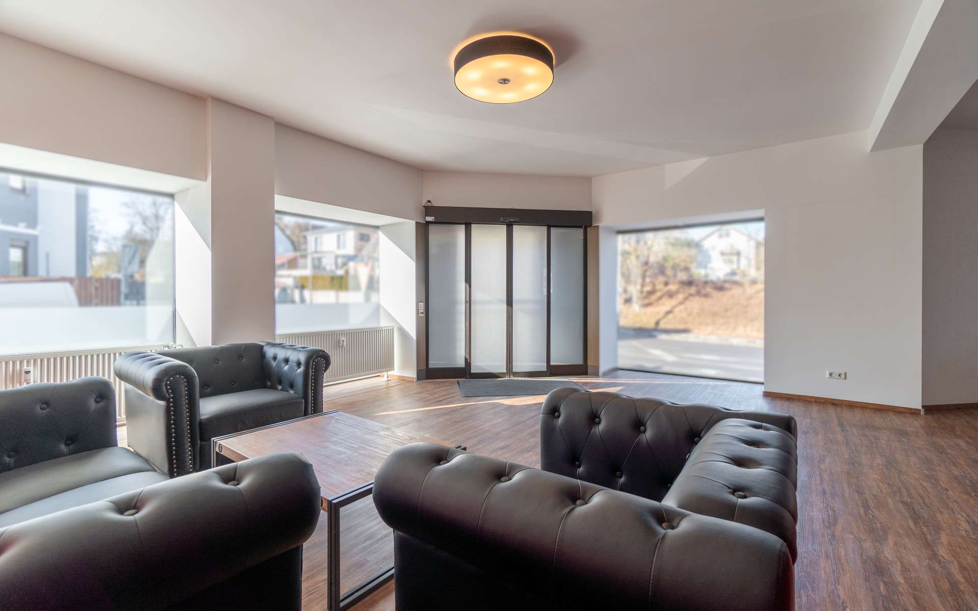 – Automatische Schiebetüre – Bodenbeläge: Fliesen und Vinyl – separates WC mit Waschbecken und Dusche – Stellplätze vor der Türe – Aufenthaltsraum – zwei Abstellräume im Keller