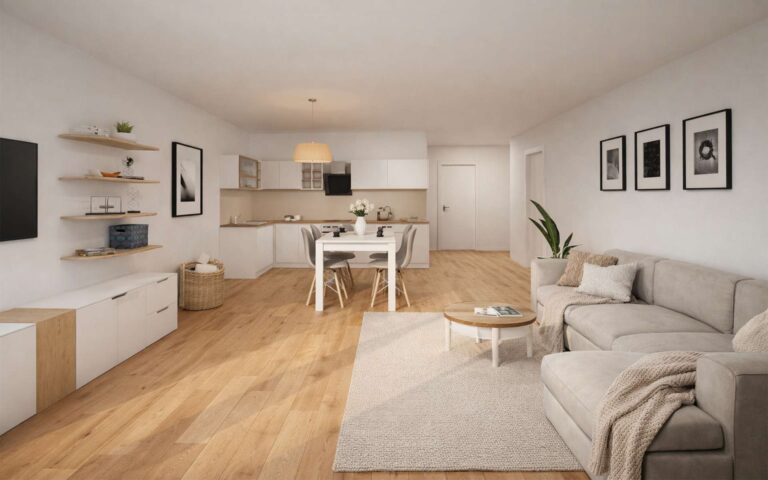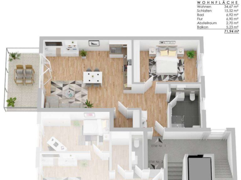 Die 2- und 3-Zimmer-Wohnungen sind auf zwei kleine Baukörper verteilt und werden nach dem aktuellen Stand der Technik, energieeffizient in klimafreundlicher Bauweise erstellt. Die Beheizung erfolgt durch eine Luft/Wasser-Wärmepumpe, während eine kontrollierte Be- und Entlüftung für ein angenehmes Raumklima sorgt. Zusätzlich wird die Nachhaltigkeit durch eine Photovoltaikanlage auf dem Dach unterstützt.